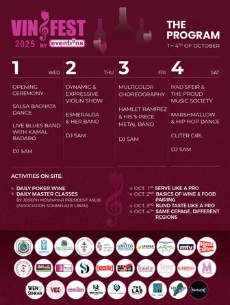 Vinifest festival has been celebrated for over 14 years, and it is a major professional and social event for the Lebanese people. Vinifest promises 4 days (1-2-3 and 4 of October 2025) of outstanding wine and food, with music and entertainment in the beautiful setting of the racecourse of Beirut. This festival is always a joyful event where Wine enthusiasts, connoisseurs, and industry experts from Lebanon and abroad should mark on their calendars.